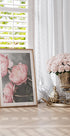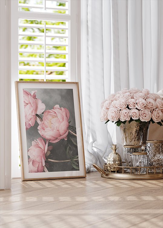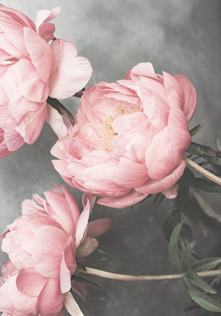 Deze elegante bloemenfoto legt zachtroze pioenrozen vast in volle bloei, met delicate bloemblaadjes die zich in sierlijke details ontvouwen. De gedempte achtergrond accentueert de romantische pastelkleuren en creëert een tijdloos botanisch kunstwerk dat schoonheid, frisheid en natuurlijke verfijning uitstraalt.