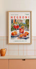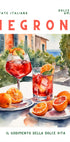 Een levendige aquarelposter ter ere van de iconische Negroni-cocktail, tegen een dromerige Italiaanse zomerachtergrond. Met zonnige sinaasappels, verfrissende drankjes en een vleugje mediterrane charme legt het kunstwerk de essentie vast het dolce vita-perfect voor keukenmuren, bars of elke liefhebber van tijdloze Italiaanse stijl.