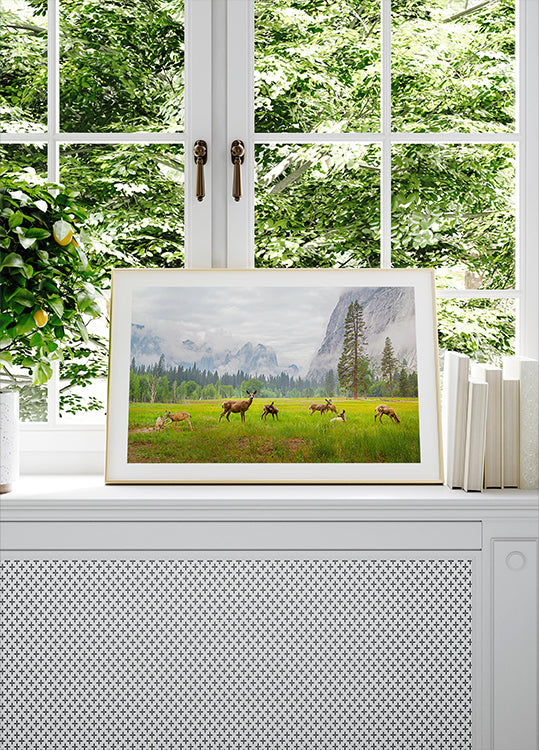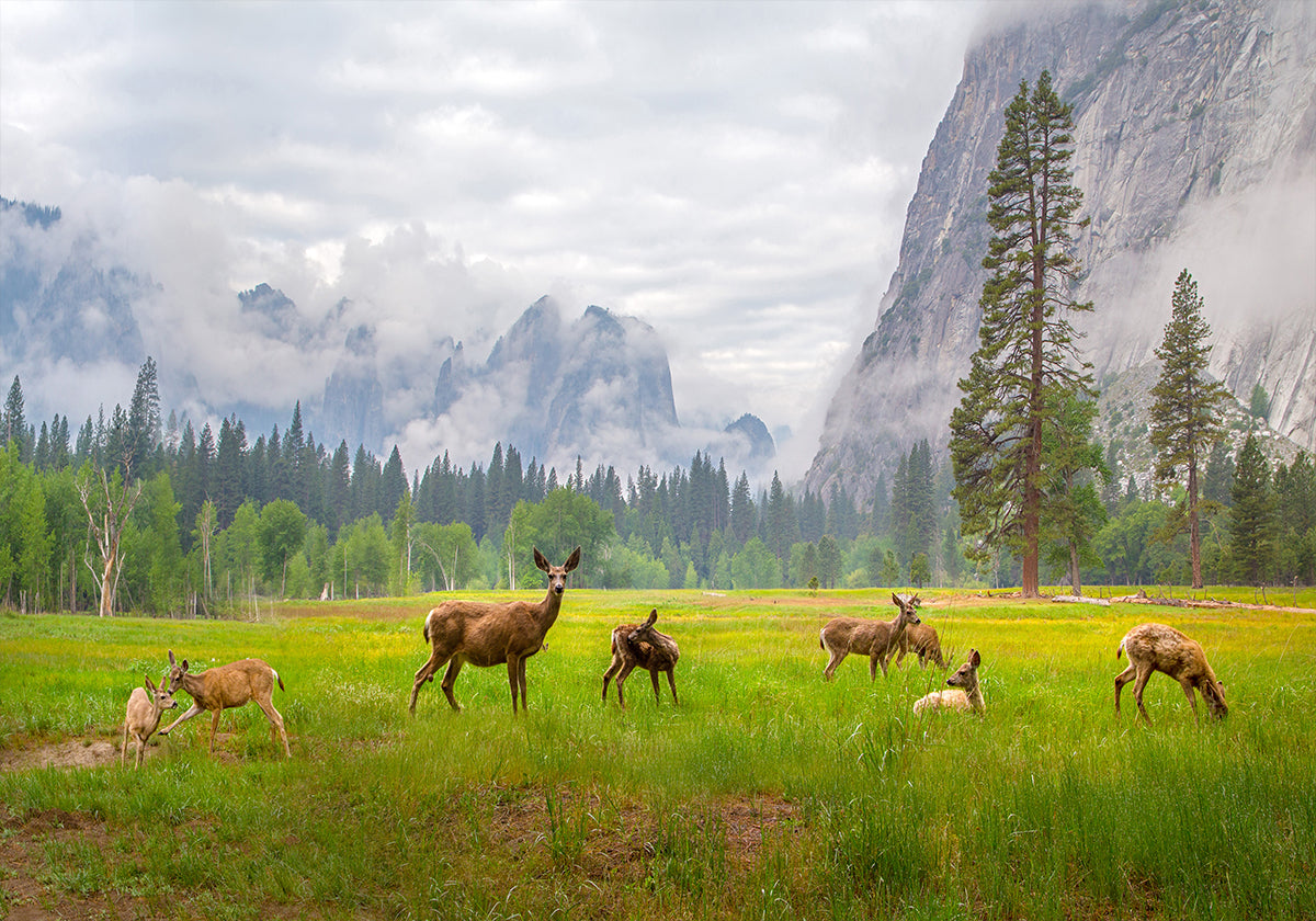 Reeën drijven door een mistige Yosemite-weide, terwijl het gewei het eerste goud van de dageraad opvangt terwijl torenhoge dennen en verre kliffen als bewakers oprijzen. Deze suggestieve scène van Dianne Mao, een stille optocht door de wildernis, nodigt uit tot een tijdloze pauze – waar vallei, bos en kudde in eeuwenoude harmonie ademen. Adem de stilte in.