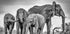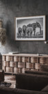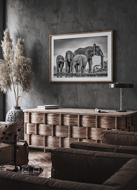 Deze krachtige zwart-witte natuurfoto toont een familie olifanten die zich bij een drinkplaats heeft verzameld. Met tedere interacties tussen jonge en volwassen olifanten weerspiegelt het thema's als bescherming, eenheid en de majesteit van de natuur - een tijdloos kunstwerk dat kracht, familie en de wildernis viert.