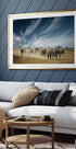 Deze krachtige natuurfoto legt een majestueuze kudde olifanten vast die onder een weidse hemel over de stoffige savanne stormt. Het tafereel straalt rauwe kracht, eenheid en de wilde geest van Afrika uit en wordt een prachtig kunstwerk dat de natuur, de vrijheid en de pracht van de wildernis viert.