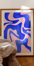Dit gewaagde abstracte kunstwerk heeft vloeiende blauwe golfvormen tegen een zachtroze achtergrond. De dynamische rondingen creëren ritme en beweging en combineren speelsheid met modern minimalisme. Een onderscheidend stuk dat frisse energie en artistieke flair toevoegt aan elke moderne ruimte.
