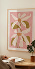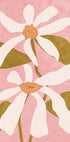 Dit moderne abstracte bloemenkunstwerk bevat elegante witte bloemen met zachte bloemblaadjes en aardse groene bladeren tegen een warme pastelroze achtergrond. Het minimalistische en toch expressieve werk verenigt botanische schoonheid met moderne illustraties en voegt frisheid en charme toe aan elk interieur.