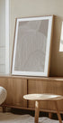 Een minimalistische abstracte poster met organische, vloeiende witte lijnen op een zachte beige achtergrond. De fijne, ritmische patronen zorgen voor beweging en textuur en combineren natuurlijke elegantie met modern design. Perfect voor moderne interieurs die rustige muurkunst in neutrale tinten willen.