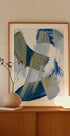 Een opvallende abstracte poster met krachtige penseelstreken in diepblauw, gedempt goud en zacht wit op een puur witte achtergrond. De vloeiende lijnen en gelaagde texturen creëren een gevoel van beweging en balans: een perfect kunstwerk voor moderne interieurs, minimalistische decoratie of Scandinavische galeriewanden.