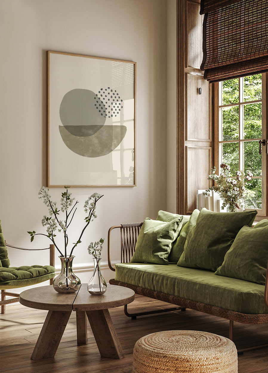 De poster toont een minimalistische compositie met organische vormen in gedempte kleuren. Een grote grijze cirkel overlapt een beige halve cirkel, terwijl een verzameling kleine, donkere stippen erboven zweeft. De achtergrond is lichtbeige, wat een rustige en harmonieuze indruk geeft. Het eenvoudige ontwerp past goed in moderne interieurs.