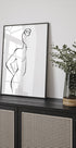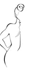 Een minimalistische lijntekening van een vrouw van achteren gezien, uitgevoerd met vloeiende zwarte lijnen op een lichtwitte achtergrond. Dit abstracte figuratieve kunstwerk benadrukt eenvoud, elegantie en vorm en is ideaal voor moderne en minimalistische interieurs.