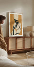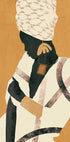 Een opvallende, minimalistische poster met een afbeelding van een elegante Afrikaanse vrouw met opvallende sieraden en een hoofddoek met patroon. De aardse gele en zwarte tinten combineren moderne abstractie met culturele rijkdom, waardoor het een sterk element is in moderne en boho-geïnspireerde interieurs.