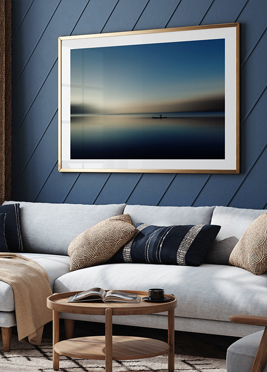 Een vredig waterlandschap waar een eenzame roeier over stil water glijdt onder een zachte hemel in kleurschakeringen. Met schilderkunstige vervaging en minimalistische compositie roept het werk gevoelens van eenzaamheid, vrede en spirituele kalmte op, waarbij het de stille schoonheid van isolatie en het meditatieve ritme van één zijn met de natuur vastlegt.