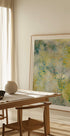 Een delicaat impressionistisch kunstwerk dat botanische vormen combineert met zachte schilderkunstige texturen. Fijne tinten groen, blauw en goudgeel creëren een dromerige en vredige sfeer die de vluchtige schoonheid van de natuur vastlegt. Perfect om een rustgevende en artistieke sfeer aan elke kamer toe te voegen