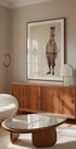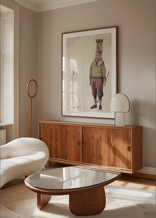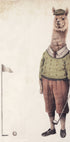 Een stijlvol en speels eerbetoon aan het groen: Mike Koubou's Alpaca Golf Club toont een elegante alpaca in een klassieke golfoutfit, midden in de swing op een rustige baan. Retrokleuren en subtiele pastelkleuren creëren een vintage sfeer met humor en charme, perfect voor sportieve muren en speelse decoraties. Een eyecatcher die de gasten laat lachen.
