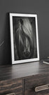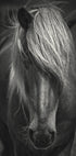 Een opvallend zwart-wit portret van een IJslands paard, waarbij de manen naar voren vallen in een stijlvolle, winderige look. De monochrome tinten benadrukken de ruwe textuur van het haar en de rustige kracht van het dier, waardoor een krachtig en toch intiem dierenportret ontstaat. Perfect voor natuurliefhebbers en minimalistische interieurs.