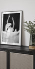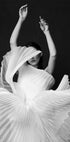 Een opvallend zwart-wit portret van een vrouw in een sculpturale geplooide jurk, midden in beweging vastgelegd. De dramatische plooien en de vloeiende stof creëren een gevoel van ritme en elegantie, dat doet denken aan zowel dans als abstracte beeldhouwkunst. Een gewaagd zwart-wit kunstwerk dat mode, beweging en kunst combineert.