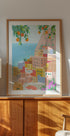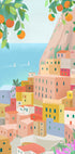 Een kleurrijke illustratie van de kust van Amalfi, waar pastelkleurige huizen van de kliffen naar de turquoise zee tuimelen. Omlijst door sinaasappelbomen en bloemen, geeft het werk de essentie van de Italiaanse zomer weer: zonnige architectuur, mediterrane charme en het plezier van reizen en vakantie.