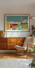 "Amsterdam Jordaan Westerkerk" af Remko Heemskerk fanger Jordaan-kvarterets charme: farverige kanalhuse på række, skarpe facader og den ikoniske Westerkerk, der rejser sig over byens tage. En grafisk, legende komposition i klare farver, der destillerer Amsterdam til ren storbypoesi. Perfekt som blikfang i hjemmet.