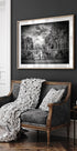 Een iconisch uitzicht over de Amsterdamse gracht met historische gevelhuizen, een klassieke brug en fietsen langs de kade. In zwart-wit worden het rustige ritme van de stad en de reflecties in het water vastgelegd, terwijl de wolken voorbijdrijven. Een tijdloos stadsbeeld van Melanie Viola dat Europese elegantie in huis brengt. Perfect voor liefhebbers van architectuur en reisherinneringen.