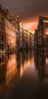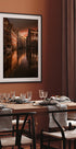 Amsterdam Evening van Luca Rebustini toont de kalmte van de schemering boven de grachten van de stad. Smalle huizen met puntgevels staan schouder aan schouder, weerspiegeld in het donkere water, terwijl warme ramen en geplaveide straten het leven achter de gevels suggereren. Een sfeervol eerbetoon aan de tijdloze architectuur van Amsterdam. Perfect om reisherinneringen en Scandinavische melancholie in de kamer te brengen.