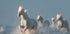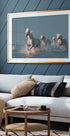 Een krachtige foto van de wilde witte paarden van de Camargue, vastgelegd terwijl ze door de golven galopperen. Waterdruppels glinsteren in de lucht en benadrukken hun kracht, beweging en wilde geest. Deze adembenemende scène drukt vrijheid, energie en de tijdloze schoonheid van de natuur uit.