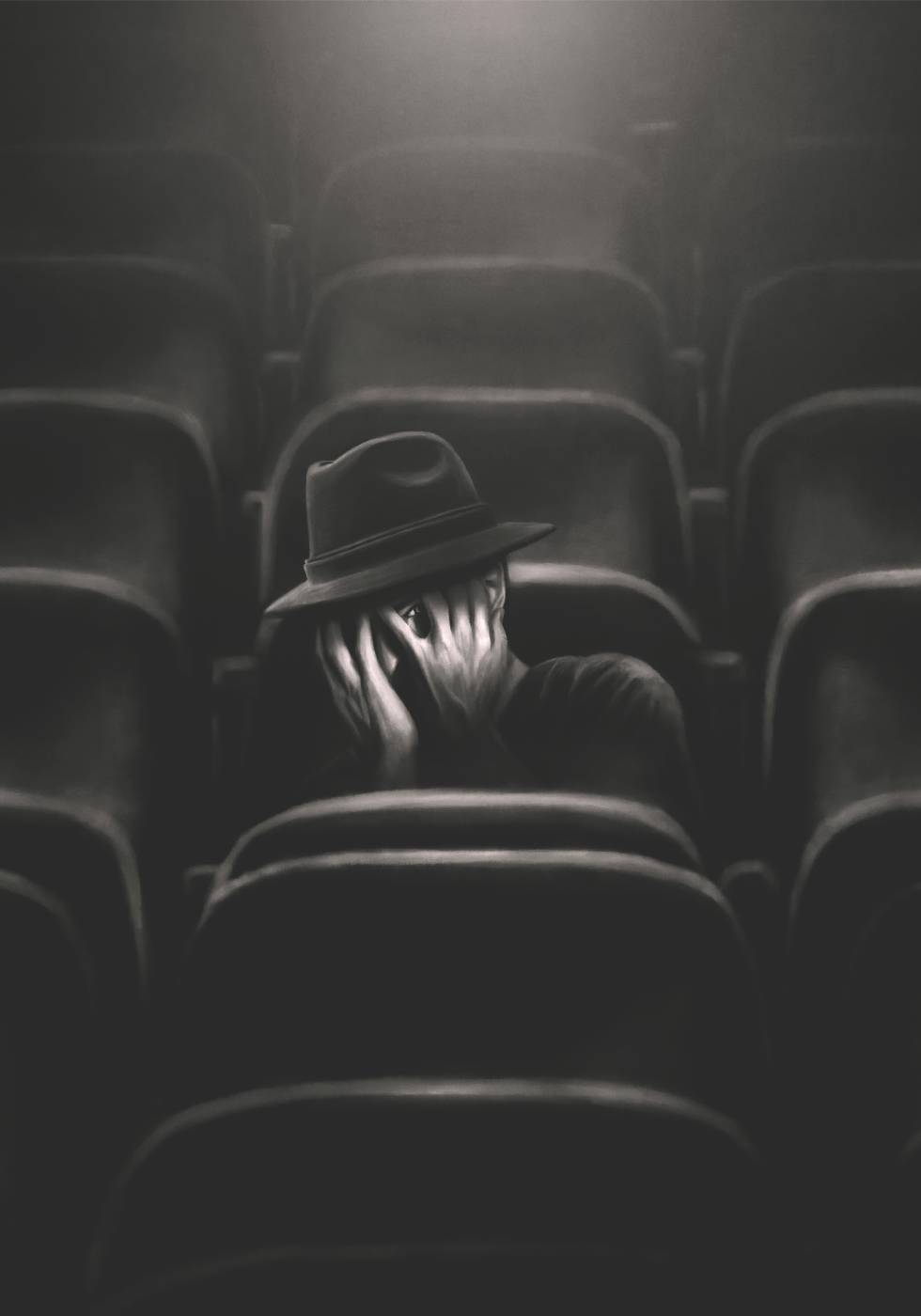 Een intens zwart-witwerk van een man alleen in een lege bioscoop, met zijn hoofd in zijn handen en één oog naar buiten starend. Een symbool van angst, toezicht en existentiële eenzaamheid.