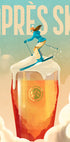 Een speelse après-skiposter met een skiër die door een schuimend bierglas naar beneden raast, een mix van alpine avontuur en après-skifeest. Met krachtige kleuren en humoristische illustraties geeft het kunstwerk de vreugde van wintersport, feestelijke drankjes en de levendige sfeer van een vakantie in de bergen weer.