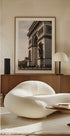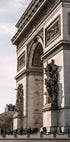 Een gedetailleerde fotografische afdruk van de Arc de Triomphe in Parijs, met de monumentale sculpturen, inscripties en het neoklassieke ontwerp. Het kunstwerk, vastgelegd vanaf straatniveau met mensen aan de voet, benadrukt zowel de grandeur van het monument als zijn plaats in het dagelijkse stadsleven.