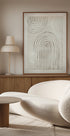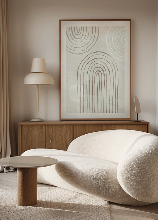 Een handgetekende abstracte poster met organische gebogen lijnen en cirkelvormige patronen in zachte beige tinten. The imperfect, flowing geometry adds warmth and texture, and gives the artwork a natural and artistic touch. Perfect voor minimalistische, Japandi- en Scandinavisch geïnspireerde interieurs.