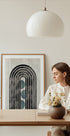 Een opvallende abstracte poster met gelaagde zwarte bogen die een kolom groene halve cirkels omsluiten. De geometrische compositie combineert symmetrie, diepte en contrast en creëert een opvallend modernistisch ontwerp. Perfect voor minimalistische interieurs, moderne ruimtes en voor liefhebbers van abstracte lijntekeningen.