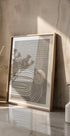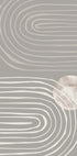 Een minimalistische abstracte poster met vloeiende gebogen lijnpatronen in zacht beige op een gedempte grijze achtergrond, geaccentueerd door een gestructureerde cirkel. De organische geometrie geeft een rustige en evenwichtige uitdrukking, ideaal voor Japandi, Scandinavische of moderne minimalistische interieurs.