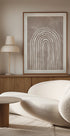 Een minimalistische abstracte poster met handgetekende gebogen lijnen in helder wit op een zachte beige gestructureerde achtergrond. De organische geometrie en neutrale kleurtonen zorgen voor een rustgevende balans, ideaal voor Japandi, Scandinavische of moderne minimalistische interieurs.