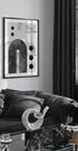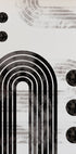 Een opvallende abstracte poster met opvallende zwarte bogen, ronde vormen en gelaagde geometrische lijnen op een licht gestructureerde achtergrond. Het monochrome palet benadrukt symmetrie en balans, waardoor het een elegant statement is in moderne, Japanse of Scandinavisch geïnspireerde interieurs.