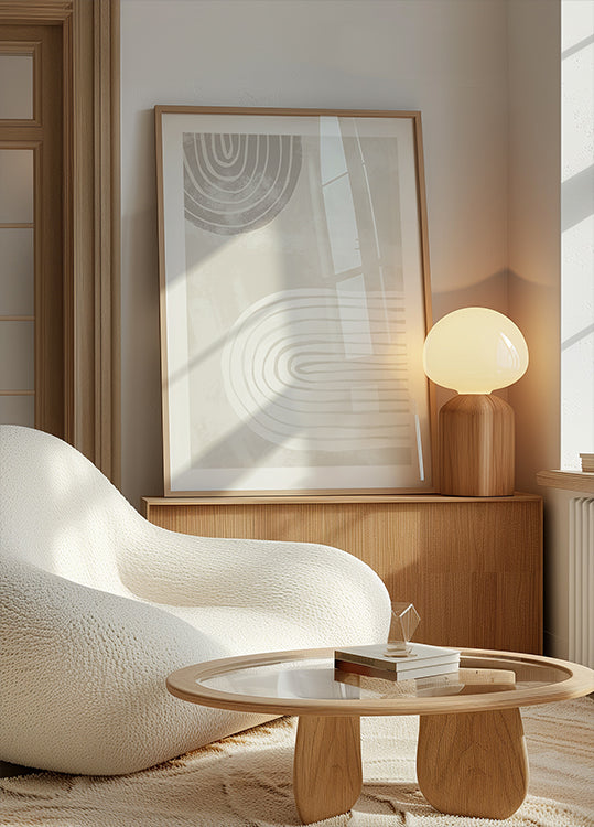 Een rustgevende minimalistische poster met twee handgetekende strikken in zachte beige en witte tinten. De organische vormen en rustige symmetrie creëren een uitgebalanceerde compositie, ideaal voor Japandi, Scandinavische of moderne interieurs.