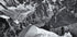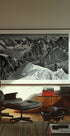 Een prachtige zwart-witfoto van een bergbeklimmer die op een smalle sneeuwrug in de Franse Alpen staat. Het dramatische uitzicht legt grillige pieken, diepe valleien en gletsjers vast die zich uitstrekken tot aan de horizon. Een krachtig eerbetoon aan avontuur, uithoudingsvermogen en de schoonheid van de alpenlandschappen.