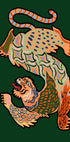 Een opvallende abstracte illustratie van een gestileerde tijger in levendige kleuren, tegen een sterke groene achtergrond. Het kunstwerk combineert geometrische patronen, vloeiende lijnen en levendige texturen om een moderne interpretatie van de katachtige geest te creëren. Een uniek, op dieren geïnspireerd kunstwerk voor liefhebbers van modern design.