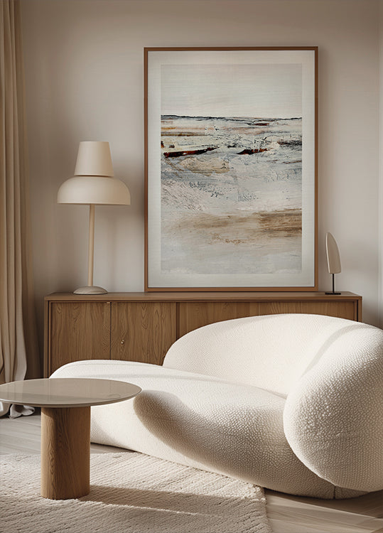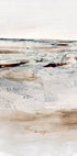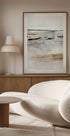 Een rustig abstract kustschilderij van Dan Hobday, met gelaagde texturen en zachte penseelstreken in aardse tinten beige, wit en vleugjes roest. De minimalistische, schilderkunstige compositie roept het gevoel op van kusthorizonnen en combineert moderne abstractie met natuurlijke rust. Een perfect stuk voor moderne interieurs met een kust- of minimalistische esthetiek.