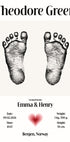 Een tijdloze en elegante gepersonaliseerde poster met babyvoetafdrukken en aangepaste geboortegegevens, waaronder naam, datum, tijd, gewicht, lengte en geboorteplaats. Het strakke, minimalistische ontwerp met een zachte, neutrale achtergrond maakt het een perfect aandenken voor nieuwe ouders en een prachtige aanvulling op elke kinderkamer of gezinsmuur.