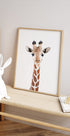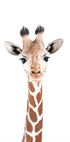 Een prachtig high-key portret van een giraffekalf, vastgelegd tegen een puur witte achtergrond. De elegante patronen, zachte ogen en lange nek benadrukken de gratie en schoonheid van dit jonge wilde dier. Perfect voor de kinderkamer, dierenliefhebbers of moderne minimalistische interieurs.