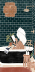 Een gezellige illustratie van een vrouw die ontspant in een badkuip en een boek leest met een handdoek om haar hoofd. Omringd door moderne badkamerinrichting, warme aardetinten en een vleugje groen straalt het werk rust en genotzucht uit. Perfect om een ontspannen sfeer in huis te creëren.