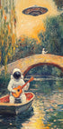 Een surrealistisch schilderij in impressionistische stijl van astronauten in een aards landschap. Een astronaut zit in een boot en speelt gitaar, terwijl een andere astronaut gebaren maakt vanaf een stenen brug onder een gouden hemel. Boven hen zweeft een UFO die sciencefiction combineert met kunstgeschiedenis in een humoristische en fantasierijke scène.