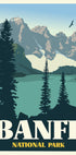 Een tijdloos reismotief uit Banff National Park: turkoois, spiegelachtig bergwater omlijst door donkergroene dennen, met met sneeuw bedekte toppen die aan de horizon oprijzen. Heldere winterlucht, stille sneeuw en scherpe reflecties vragen om avontuur. Elegante typografie maakt de iconische sfeer compleet. Een eenzame vogel zweeft over het meer.