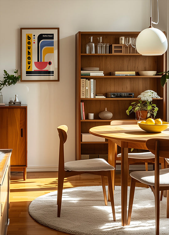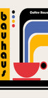 Een op Bauhaus geïnspireerde koffiehuisposter met opvallende geometrische vormen in rood, geel, blauw en zwart. Het abstracte ontwerp toont een dampende koffiekop in pure Bauhaus-stijl, die functionaliteit combineert met artistieke eenvoud. Perfecte muurkunst voor retrokeukens, cafés en liefhebbers van vintage modernisme.
