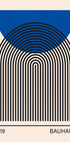 Een opvallende abstracte Bauhaus-poster uit 1919, met zwarte concentrische boogachtige lijnen die een hypnotiserend patroon vormen, bedekt met een opvallende blauwe halve cirkel. Het minimalistische ontwerp creëert harmonie en balans en weerspiegelt perfect de Bauhaus-filosofie van het verenigen van geometrie, eenvoud en expressie. Een tijdloos stuk voor moderne interieurs en Bauhaus-liefhebbers.