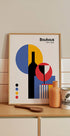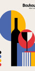 Een moderne op Bauhaus geïnspireerde poster met een wijnfles en een wijnglas, gestileerd met opvallende geometrische vormen in zwart, rood, geel en blauw. Dit abstracte ontwerp combineert de elegantie van wijn met de tijdloze Bauhaus-esthetiek, perfect voor bars, keukens, eetkamers en wijnliefhebbers.