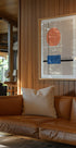 Een minimalistische, op Bauhaus geïnspireerde poster met opvallende geometrische vormen, waaronder een grote oranje cirkel en een opvallende blauwe rechthoek op een beige achtergrond. Rechte lijnen en eenvoudige contrasten maken dit kunstwerk tot een tijdloos element in zowel moderne als vintage interieurs.