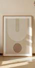 Een stijlvolle, minimalistische poster met strakke witte bogen gecombineerd met een effen bruine cirkel op zachte beige tinten. De geometrische compositie weerspiegelt het moderne design uit het midden van de eeuw en voegt warmte, eenvoud en elegantie toe aan elk interieur.