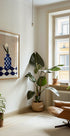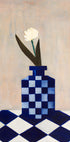Een modern stilleven met een opvallende blauw geblokte vaas en een enkele, delicate bloem. Met de combinatie van geometrische patronen en minimalisme brengt dit stuk elegantie en artistieke charme in moderne interieurs.
