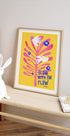 Een vrolijke en motiverende poster met twee witte duiven die vliegen tussen sterke roze bladeren en blauwe bloemen op een levendige gele achtergrond. De speelse typografie "Glow with the Flow" voegt een opbeurende boodschap van positiviteit en vreugde toe. Perfect om een goede sfeer in elke kamer te brengen.