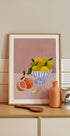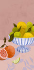 Een charmante stillevenillustratie van een gestreepte kom gevuld met citroenen en limoenen, vergezeld van een gesneden bloedsinaasappel en een partje limoen. Met warme tinten en pittoreske texturen zorgt dit kunstwerk voor een frisse, mediterraan geïnspireerde sfeer, perfect voor een keuken of eetkamer.