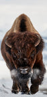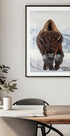Een krachtige natuurfoto van een bizon die door de sneeuw stormt. Met een ijskoude adem en sneeuw op zijn gezicht legt dit dramatische beeld de rauwe kracht, het uithoudingsvermogen en de majestueuze aanwezigheid vast van een van de meest iconische dieren van Noord-Amerika.