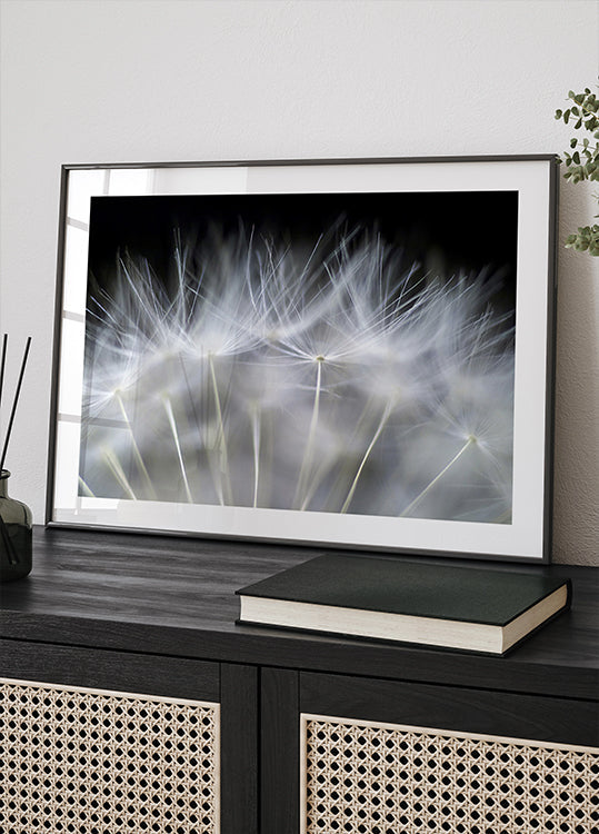 Een delicate macrofoto van paardenbloemzaden, die hun luchtige zachtheid en schoonheid vastlegt. De close-up benadrukt het fragiele en vluchtige karakter van deze luchtige plukjes.
