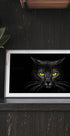 Een krachtig close-upportret van een zwarte kat met doordringende gele ogen die gloeien in het donker. Deze rustige foto legt mysterie, elegantie en intensiteit vast, waardoor het een opvallend kunstwerk is voor elk modern interieur.